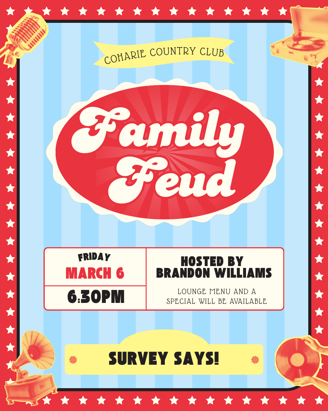 On March 6 at 6:30 Coharie will conduct the next round of Family Feud hosted by Brandon Williams. Please plan to attend this very special event. Please call the lounge if you are interested in forming a team of six to compete, otherwise this is not a RSVP event.