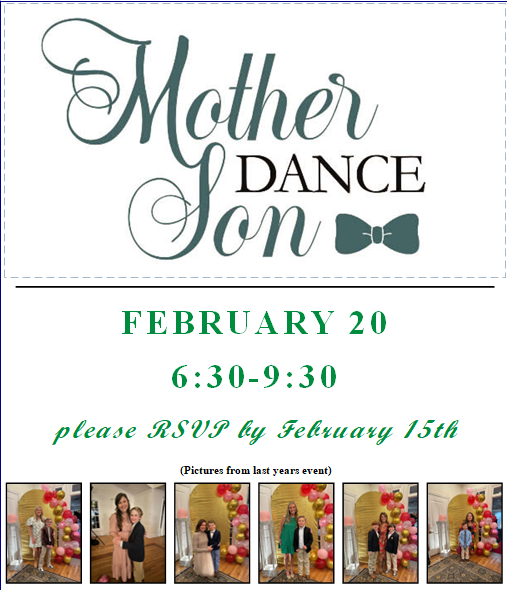 Mother/Son Dance Feb 1 Written By Randy Wiggins The Mother/Son Dance will be held on February 20 from 6:30-9:30pm. Please call by February 15 to make reservations. Randy Wiggins