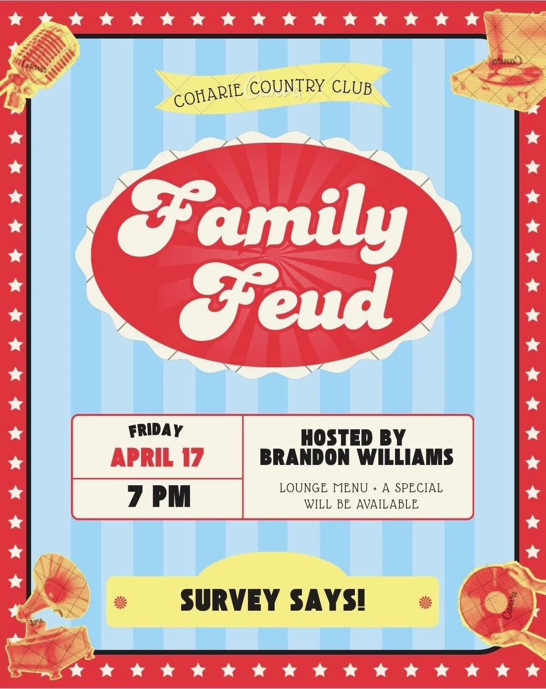 Back to All Events Family Feud hosted by Brandon Williams Friday, April 17, 2026 7:00 PM 9:00 PM Coharie Country Club 101 Coharie Lane Clinton, NC 28328 (map) Google Calendar ICS