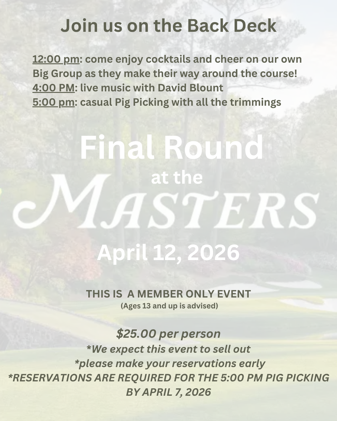 Mark your calendar for April 12. Coharie will host a party to coincide with the final round of the Masters. Join us beginning at noon for cocktails on the back deck and cheer on our own Big Group as they play #9. Beginning at 4pm there will be live music provided by David Blount. The Pig Picking will begin at 5pm (see page 2 for the menu). This is a members only event with ages 13 or older recommended. Please call for reservations by 5pm on April 7.