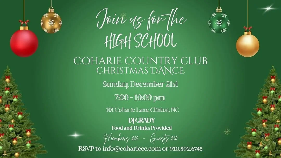 The Annual High School Christmas Dance will be held on Sunday, December 21 from 7-10pm. Call for reservations today.